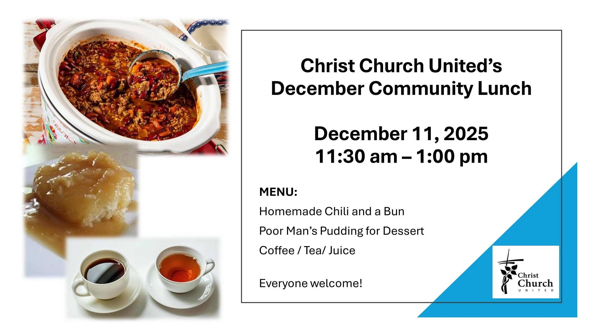 Come out and join us for our last monthly luncheon of the year on Dec 11 from 11:30-1:00pm. The menu is homemade chili and a bun, followed by poor man’s pudding for dessert. Tea/coffe/juice are served. We look forward to hosting you! Donations gratefully accepted.