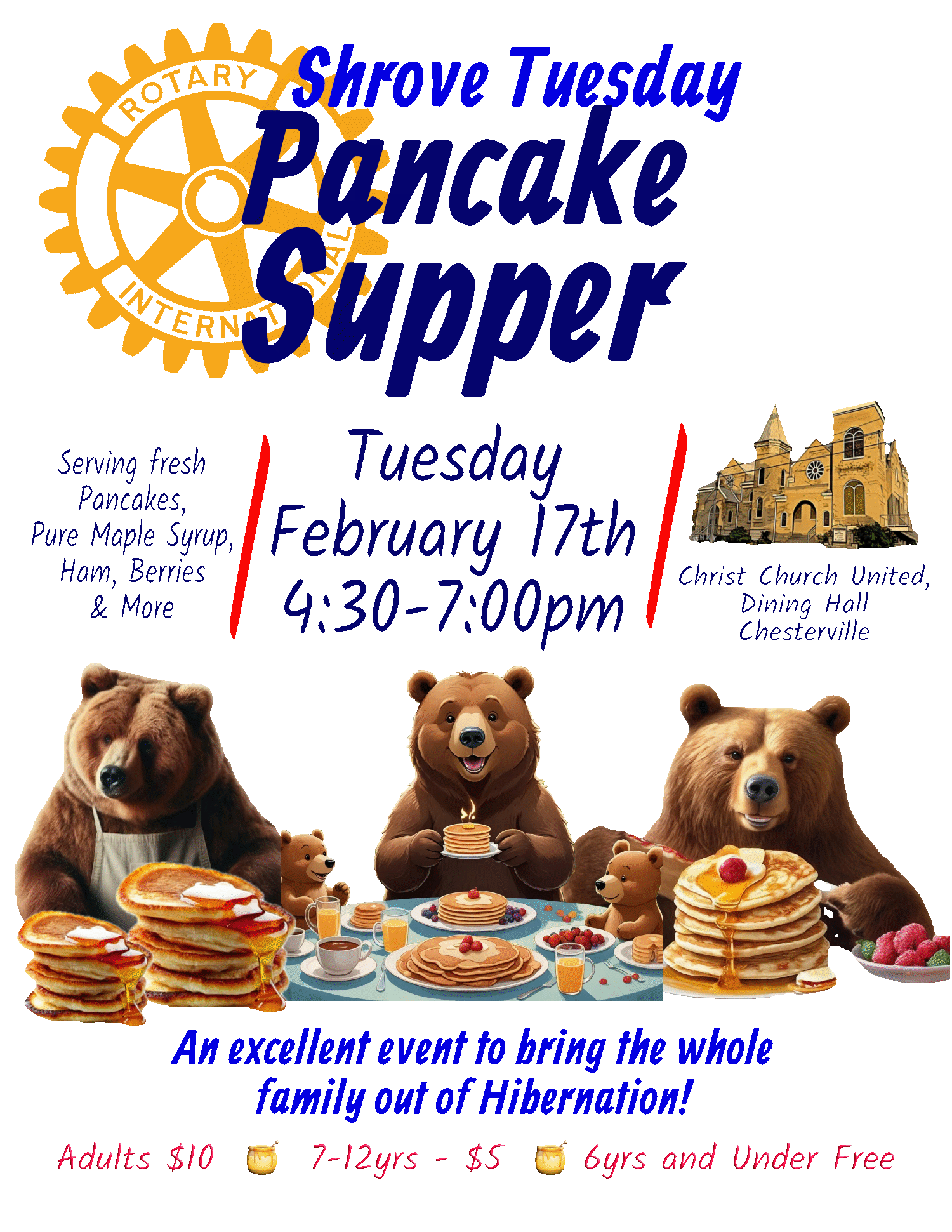 Social fun and pancakes; join us in the Dining Hall as the Rotary Club serves up pancakes for the whole family.