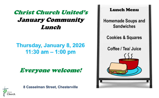 Join us for our first community luncheon of 2026! Donations gratefully accepted. Location is the Dining Hall, lower level of CCU.